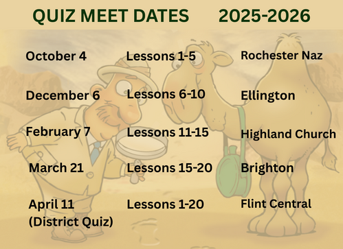 Children's Quizzing is a six-year Bible study program with a competition element, designed for school-age children. This year 2025-2026, students will be studying the book of Genesis. Through active learning, the stories will come to life as children learn and understand scripture. Students will follow Dr. Digalot and Canteen the Camel as they dig into the Word and discover Biblical truths.